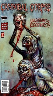 First published back in November of 2003, the special edition one-off comic ‘Unleashing The Bloodthirsty’ was originally included within US Death Metal veterans Cannibal Corpse’s box set ‘15 Year Killing Spree’. However, the comic was also later included in the German Special Edition release of the band’s ninth studio album ‘The Wretched Spawn’ (2004). The comic’s story is based on the band’s song ‘Unleashing The Bloodthirsty’ that was included on their seventh studio album ‘Bloodthirst’ (1999). Indeed, the only text in the comic are Alex Webster’s gore drenched lyrics from the original song.