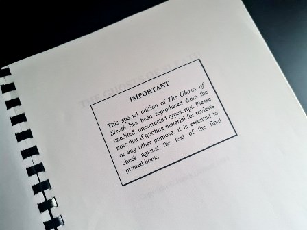 Prior to the novel’s release, five-hundred copies of the unedited typescript of the novel were printed and bound for advance distribution to booksellers. Each copy was individually signed by the author and hand numbered. These ARCs of the novel were bound with a comb binding and the entire unedited novel was printed single-sided.