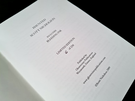First published back in 1998 for the anthology ‘More Monsters From Memphis’ (1998), then later reprinted in 2000 for ‘Electric Wine’ (2000) and again in 2003 for ‘Mystery In Mind’ (2003); American author Scott Nicholson’s short story ‘Haunted’ eventually found itself forming the principal tale to a February 2009 Ghostwriter Publications chapbook, released under the short story’s title and limited to just 250 copies. Also included in the nineteen page publication is another one of Nicholson’s shorts, this one entitled ‘Bleeding Ink’.