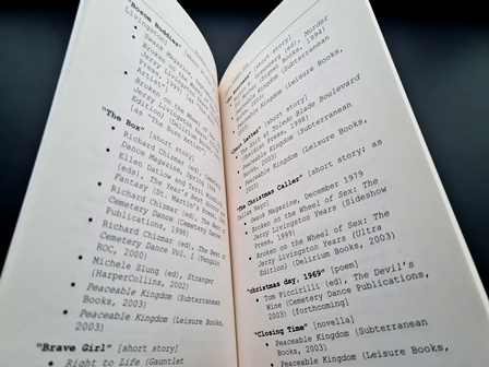 The chapbook provides a listing of the published works of Jack Ketchum, up to the date of the chapbook’s publication (August 2003). This includes pieces credited to Dallas Mayr, Jerzy Livingston, Bruce Arthur, and Dallas Ketchum, or titles that were published uncredited (unless they were later published under Jack Ketchum).