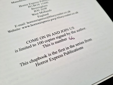 First published as a standalone chapbook back in 2004 by Horror Express Publications, the ‘Come On In And Join Us’ chapbook was limited to just 100 copies, each hand numbered and signed on the inside cover. The chapbook was the first publication in a proposed ‘Horror Express Chapbook Series’, which only saw the release of one further title – Marc Shemman’s ‘The Forest’ (2004) which was limited to just fifty copies.
