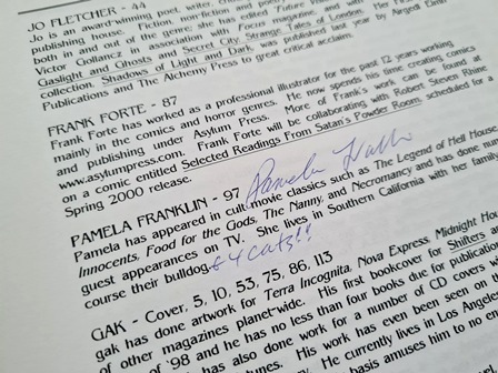Sabrina Fontaine Kaleta, Richard Laymon, Robert Masello, Mel Whitlow, Nick Bougas, Barry Barnes, Staci Layne Wilson, William F. Nolan, Steve Rude, Peter Atkins, Pamela Edwards, David Quinn, Frank Dietz, Del Howison, J.F. Gonzalez, Chuck Williams, Jason Voss, Bernie Wrightson, Robert Steven Rhine (along with his fingerprint!), Lisa Morton, Rick Pickman, Tony Gleeson, Christa Faust, Arturo Rubio Jr, and Pamela Franklin.