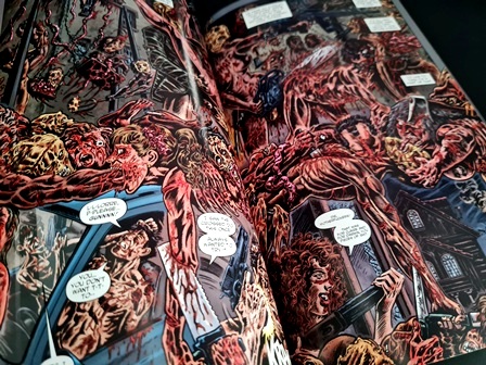 Artist Raulo Caceres more than rises to the challenge of visualising these horrendous acts – laying down maddening scenes of sheer carnage that pull your eyes into the maelstrom of flying body parts and fountains of cascading blood. Flesh is torn on pretty much every other page. And when the madness kicks in, more often than not you’re treated to a full double-spread of the atrocities. Not once does Lapham or Caceres shy away from showing the full graphic horror of what’s going on. This is 100% no-holds-barred extreme horror plain and simple.