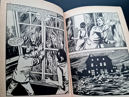 As with so many of this 1970s comics, the story’s full of hilarious cliches. So, we have, poor old Nancy Bridges who likes to faint when faced with something spooky. Luckily, Tom Bridges has no qualms facing down a bunch of ghosts clambering at the vast windows. All in a day’s work for our Tom!