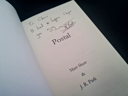 First published back in April of 2017, extreme horror author Matt Shaw and new wave pulp horror poster boy J.R. Park put their dark and twisted imaginations together to pen their co-written novella ‘Postal’.