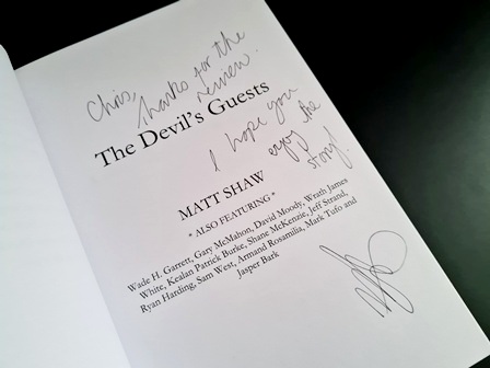 So there you have it. Matt Shaw’s ambitious collaboration novel ‘The Devil’s Guests’. It’s certainly one mind-melting bastard of a read. So much murder, mayhem and depravity is unveiled within its pages. So much cruelty and perversion. Questions of comeuppance are tentatively raised like saplings breaking through cracks on an alleyways grime-stained pavement. But ultimately it’s the chaotic storm of uncontrollable madness that sweeps you away again and again.